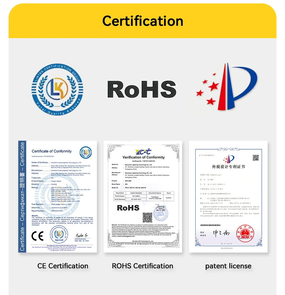 Matériaux : ABS + PC | Entrée : 100-240V, 50/60Hz | Dimensions : selon prise US/EU/UK | Poids : 40-48 g | Certifications : CE